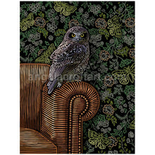 The NZ owl is a small bird, this one has spotted the puriri moths in the wallpaper and come in for a closer look. Available in two formats.